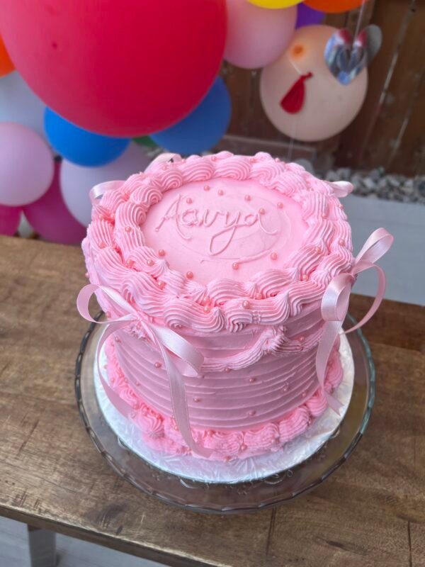 A dreamy vintage-style cake adorned with delicate ribbon bows and elegant buttercream piping for a timeless, romantic look.
